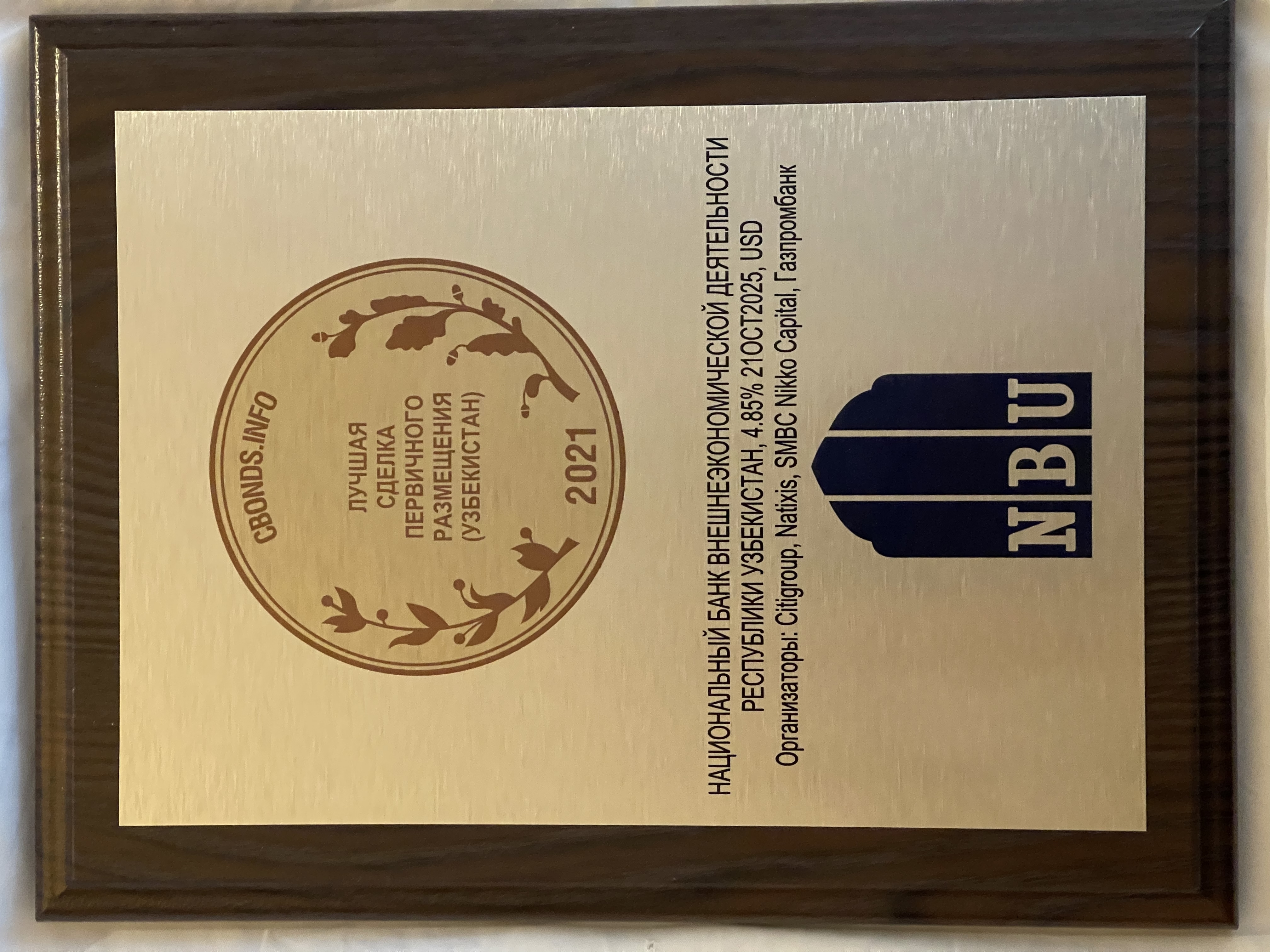 Опыт Узнацбанка по проведению операций на рынке капитала был признан международной группой компаний Cbonds, являющейся информационным агентством, специализирующимися в сфере финансовых рынков, и Узнацбанк был удостоен награды Cbonds Awards CIS в номинации «Лучшая сделка первичного размещения».