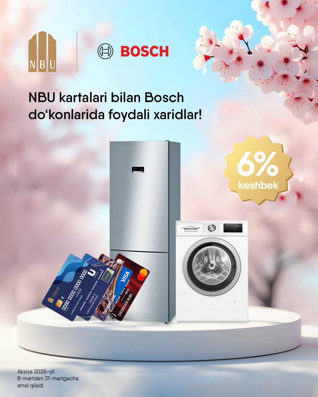 2025-yil 8-martdan 31-martgacha O‘zbekistondagi Bosch kompaniyasining 15 ta rasmiy do‘konlaridan birida O‘zbekiston Milliy banki kartalari (virtual kartalaridan tashqari) orqali xarid qilgan mijozlar, xarid summasidan qat’i nazar, 6% miqdorida keshbekka ega bo‘ladilar.