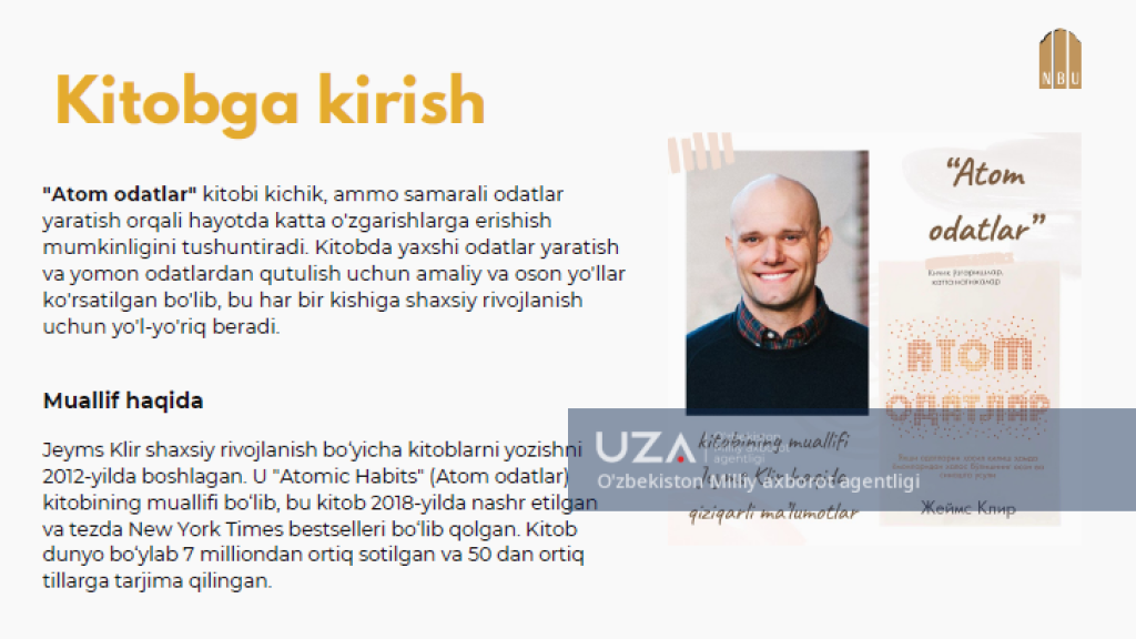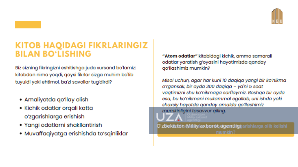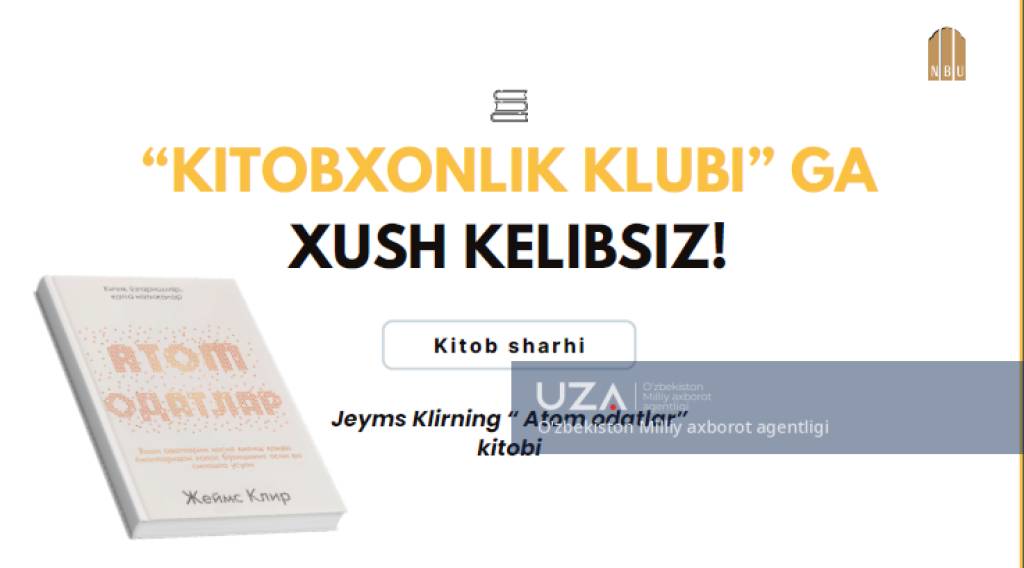 “O‘zmilliybank” AJ tomonidan xodimlarning ish vaqtidan tashqari bo‘lgan vaqtini yanada mazmunli o‘tkazishni ta’minlash, kasbga bo‘lgan mas’uliyatini oshirish hamda atrofdagilar bilan muloqot madaniyatini yuksaltirish maqsadida “Kitobxonlik klubi” tashkil etildi. Unda yilning har bir oyi uchun eng sara asarlar tanlab olinib, kitobxon xodimlar o‘rtasida oyning oxirgi juma kunlarida onlayn platforma orqali muhokama o‘tkazilmoqda. Yanvar oyining tanlangan asari sifatida mutolaa etilayotgan “Atom odatlar” kitobi bank xodimlarida yuqoridagi singari ijobiy taassurotlarni uyg‘otayotgani bilan ahamiyatli, bo‘ldi dеyish mumkin.